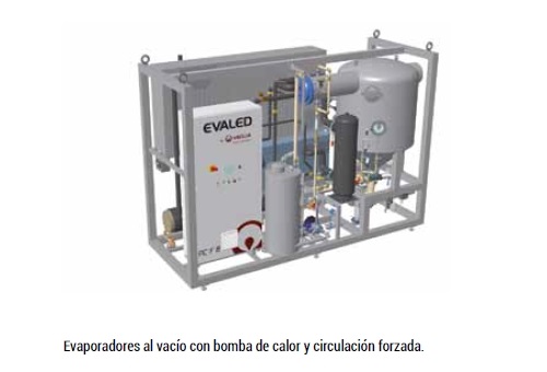 - Evaporación al vacío por compresión mecánica del vapor: trata de recuperar el calor latente de condensación del destilado como fuente de calentamiento del líquido a evaporar. La temperatura del vapor generado en la evaporación, se incrementa mediante compresión del propio vapor. De esta manera el vapor sobrecalentado puede ser reciclado por medio de un intercambiador del propio evaporador consiguiendo así un doble objetivo: por un lado, ahorro de energía para la evaporación y, además, se evita utilizar el medio refrigerante para la condensación (torres de refrigeración, etc.). La evaporación mediante compresión mecánica del vapor es el sistema de evaporación mediante corriente eléctrica de mayor eficacia energética.