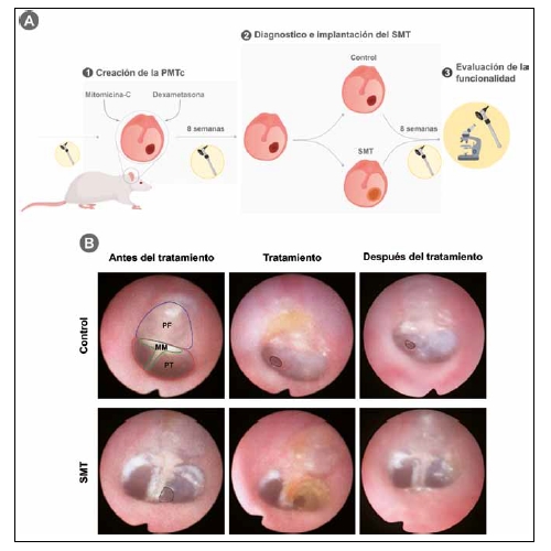 Evaluación de la funcionalidad e integración del SMT en un modelo de PMTc. A) Etapas y flujo de trabajo del ensayo in vivo. B) Evaluación otoscópica de la implantación in vivo del SMT. En la imagen superior izquierda se muestra una MT sana donde se distinguen las principales estructuras que componen el tímpano (PF: pars fláccida, PT: pars tensa, MM: mango del martillo). En el resto de imágenes se presenta el seguimiento realizado a las perforaciones de control (sin tratamiento) y las tratadas con el SMT, antes de la perforación, el día de tratamiento y a tiempo final tras 2 meses desde la colocación del injerto.