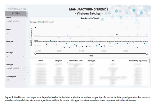 - Reporting: Viralgen ha apostado por la democratización de los datos, facilitando a todos los empleados acceso a información consolidada a través de dashboards interactivos. Estos dashboards permiten visualizar y analizar tendencias sobre datos de proceso, asociarlos con controles de calidad y monitorizar estudios de estabilidad y KPIs (Key Performance Indicators) entre otros (Figura 1).