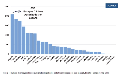 Si nos centramos en los ensayos clínicos con medicamentos, España sube al número uno del ranquin de la Unión Europea, participando en hasta el 43% de los ensayos clínicos activos con 836 ensayos clínicos registrados en el Registro Español de Estudios Clínicos (REEC) y la plataforma CTIS (Clinical Trials Information System), por encima de países como Francia (734), Alemania (697) o Italia (576), según datos de 2023.