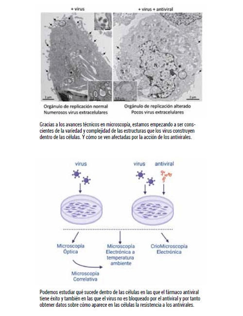 Para estudiar la capacidad antiviral de un compuesto, se aplican técnicas de virología y bioquímica. Si además se aplican técnicas de microscopía óptica y electrónica, la caracterización del nuevo compuesto será mucho más completa3. La microscopía óptica de células vivas nos permite estudiar las infecciones virales de manera dinámica y a tiempo real. Por otro lado, los virus son pequeños y dado que su tamaño va de unos pocos nanómetros a aproximadamente una micra, sólo pueden verse con detalle con la resolución que proporciona el microscopio electrónico, que consigue una magnificación y resolución espacial de más de mil veces superior a la que proporcionan los microscopios ópticos4. La microscopía electrónica nos da detalles de cómo los virus entran en las células, cómo construyen las factorías donde replican su genoma y donde ensamblan los nuevos virus infecciosos y cómo salen de las células. Gracias a los avances técnicos en microscopía, estamos empezando a ser conscientes de la variedad y complejidad de las estructuras que los virus construyen dentro de las células5. Y cómo se ven afectadas por la acción de los antivirales.