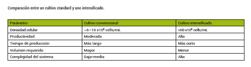 - Si es necesaria una alta productividad volumétrica (g/L/día) y el biorreactor es pequeño. (Ideal en campañas clínicas o producción temprana con limitaciones de volumen)