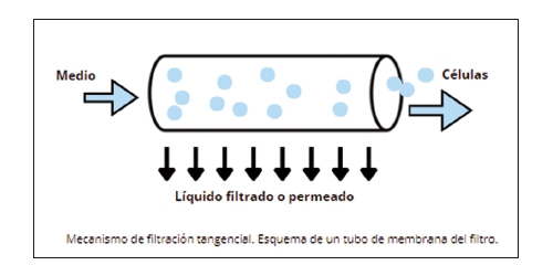 Dado que, en este filtro la dirección del flujo es paralela a la superficie del medio filtrante, la velocidad del medio que ingresa impulsa a las células hacia la salida. Mientras que el medio líquido (filtrado) sale en forma perpendicular a través de la membrana del filtro debido a la presión del fluido obteniéndose un flujo del filtrado que sale del filtro tangencial. El filtrado se recoge por conductos diferentes a las células, las cuales van acompañadas por una fracción de medio de cultivo agotado.