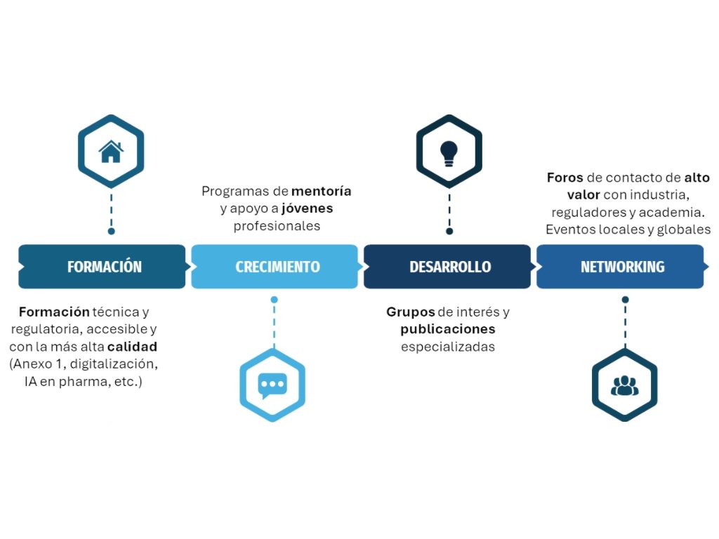 Este entorno favorece el desarrollo de competencias clave para el crecimiento profesional, como el liderazgo técnico, el pensamiento crítico, la capacidad de análisis y toma de decisiones en entornos regulados, la gestión del riesgo y una visión estratégica de la calidad alineada con los principios de mejora continua. Participar activamente en el Chapter es una oportunidad para ejercer liderazgo técnico, influir en el desarrollo de conocimiento y ser parte de los grupos de trabajo que definen los consensos industriales. Todo ello contribuye a reforzar el posicionamiento profesional de los miembros y a consolidar perfiles con una comprensión integral de los desafíos actuales y futuros de la industria biofarmacéutica.