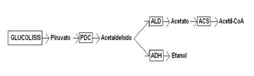 El producto final obtenido en la glucolisis, es decir, el piruvato, puede ser respirado o fermentado (véase figura 1). Para el caso de Saccharomyces cerevisiae el piruvato ingresará en la vía respiratoria si la concentración de glucosa en el medio es inferior a 0.15 g/L, o si la velocidad de dilución es inferior a 0.22 H-1 (Rehm y Reed, 1991), siempre y cuando se den condiciones adecuadas de aerobiosis. Con concentraciones mayores de glucosa, el piruvato será metabolizado por la vía fermentativa, independientemente de la presencia de oxígeno. Esta especie de by-pass que aparece al final de la glucolisis y que lleva a una vía respiratoria o fermentativa, es la denominada ruta metabólica de la piruvato deshidrogenasa.