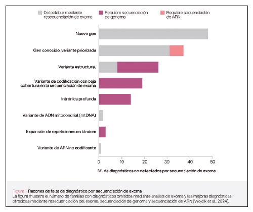 Un estudio reciente, publicado en New England Journal of Medicine (Wojcik et al., 2024), mostró la capacidad mejorada de la secuenciación de genoma frente al exoma, concluyendo que la secuenciación mediante WGS permite el diagnóstico de un 8% de pacientes adicionales a la secuenciación de exomas (Figura 1). Este método es especialmente útil cuando las variantes genéticas responsables de una enfermedad no se encuentran en las regiones codificantes del ADN, que es lo que analiza el exoma, sino en regiones no codificantes o intrónicas profundas, las cuales solo pueden ser detectadas mediante la secuenciación del genoma completo. Los análisis de exoma y genoma completo mediante tecnologías de lecturas cortas indican una elevada capacidad diagnóstica, sin embargo, únicamente permitieron identificar variantes causales en el 30% de familias con sospecha de patologías genéticas. Esta limitación puede deberse la presencia de variantes complejas, regiones especialmente repetitivas, variantes estructurales, expansiones de repeticiones en tándem y variantes no codificantes intrónicas profundas que no pueden detectarse de manera fiable mediante la batería de análisis genéticos disponibles actualmente en laboratorios de diagnóstico clínico.