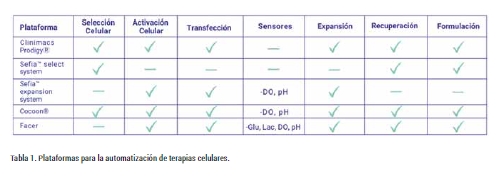 Es importante destacar que las plataformas Clinimacs Prodigy® de Milteny Biotec y SefiaTM expansión system de Cytiva sólo son capaces de expandir cultivos en suspensión y en adherencia, respectivamente. Las plataformas Cocoon® de Lonza y Facer de Aglaris Cell pueden cultivar los dos tipos de cultivos celulares.