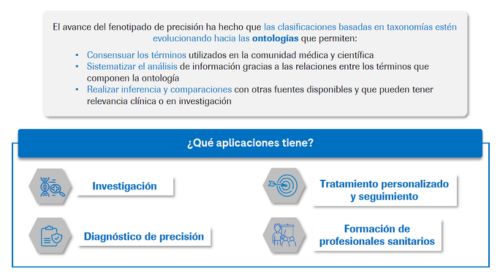 El estudio y abordaje de las enfermedades se basa, en líneas generales, en la observación de las características observables, signos y síntomas que presentan los pacientes, lo que se conoce como fenotipo. Sin embargo, con el desarrollo de la Medicina Personalizada de Precisión, las ciencias ómicas y la disponibilidad de grandes cantidades de datos procedentes de diferentes fuentes, este enfoque queda obsoleto. En este contexto, nace el fenotipado de precisión, dirigido a caracterizar de manera profunda los estados de salud y enfermedad con el fin de conocer las relaciones que existen entre los distintos factores que afectan a su desarrollo y los rasgos, signos y síntomas que tienen lugar en una persona; con el objetivo de crear una terminología codificada y estandarizada a nivel internacional, que permita el manejo e interpretación de la información médica por cualquier persona u ordenador y en cualquier sistema o contexto sanitario.