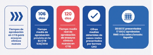 De los 38 nuevos ensayos clínicos que hemos presentado por CTIS, hasta la fecha hemos recibido la aprobación de 17. Hemos calculado la media de días en la que hemos recibido esta aprobación y el resultado es de 120 días, es decir, 14 días más del tiempo teórico que establece la regulación, que, como hemos comentado, son 106 días. La causa, en este caso, ha sido la parada de reloj en Navidad y los días de fiesta de los Estados Miembros Implicados.
